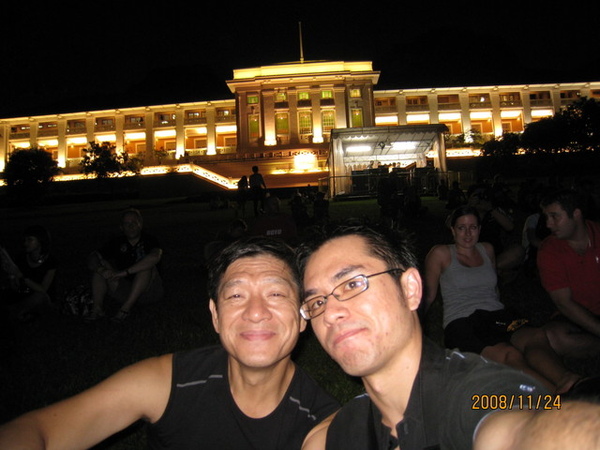 百萬死亡上回也是來這兒演出,哪根筋不對居然沒去看;父子倆湊著舞台對面的帥氣白色建築物(萊佛士辦公處?),留下值得紀念的一頁!
