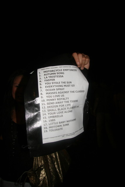 James歌喉的確一級棒,娘味十足的貝斯手Nicky Wire沒有把花圈拿起來戴,因為站在第三排和舞台相當接近,十分確信Nicky有看到我淚流滿面的蠢樣,這種和樂手四目交接彼此會心一笑的秘密結社滋味,第一次如此具體的在我身上發生.